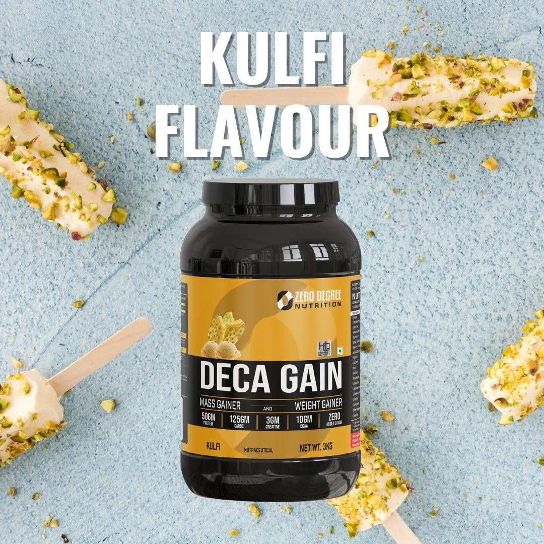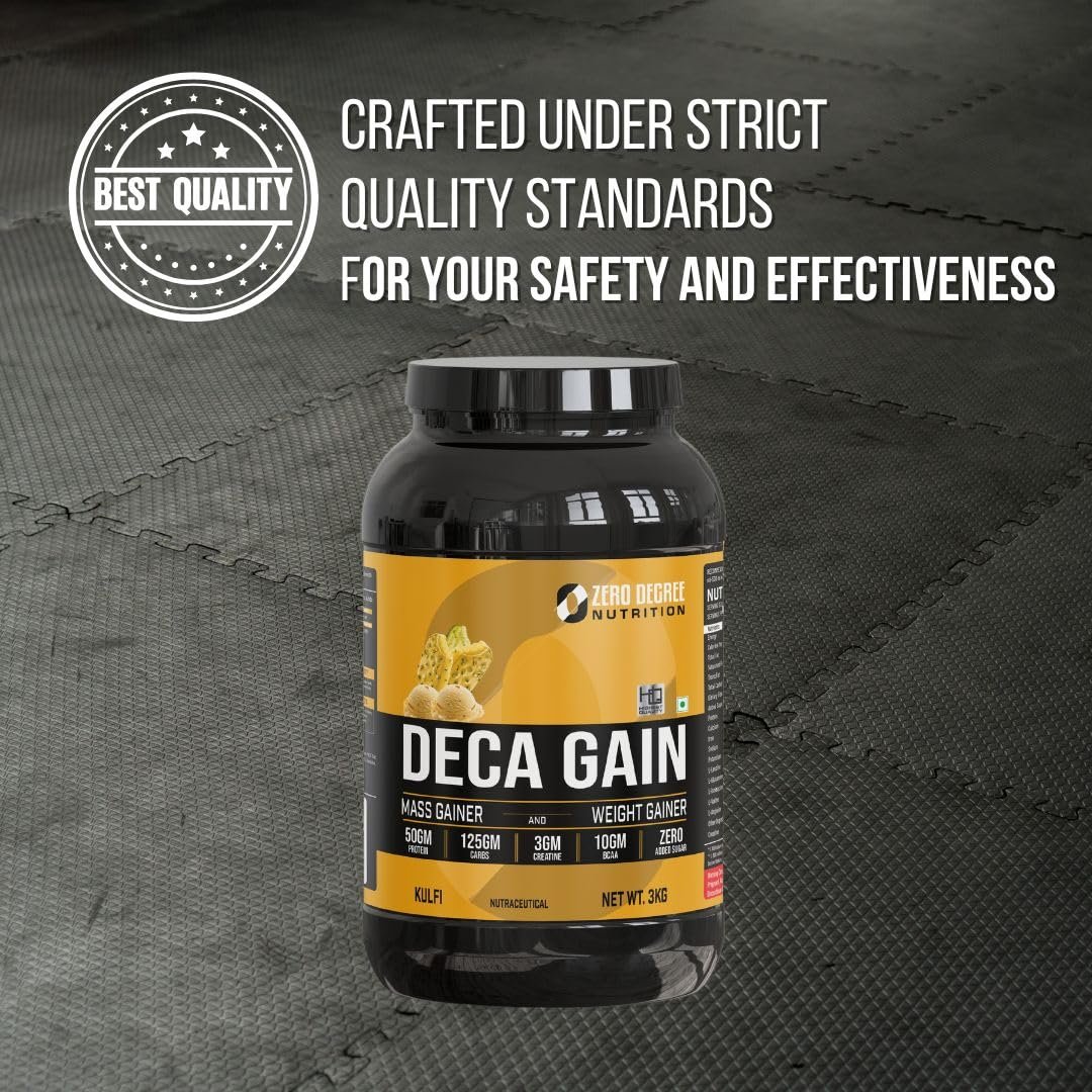 - START GAINING MASS: Build the size that creates big moments when you train with the blend of protein, creatine, and carbohydrates in ZERO DEGREE Performance Deca Gain high-calorie mass gainer.